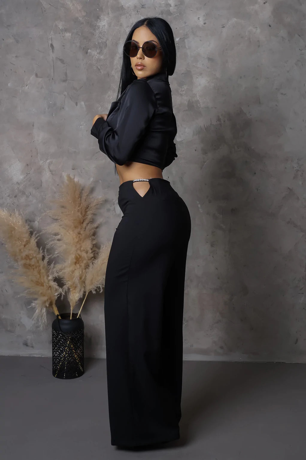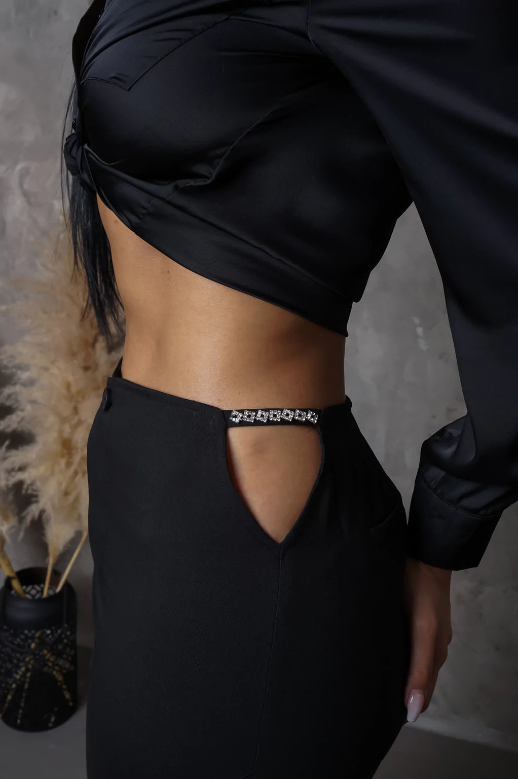 Pantalón con accesorios de rhinestones en el area de la cadera. tiene zipper, corre justo al size.