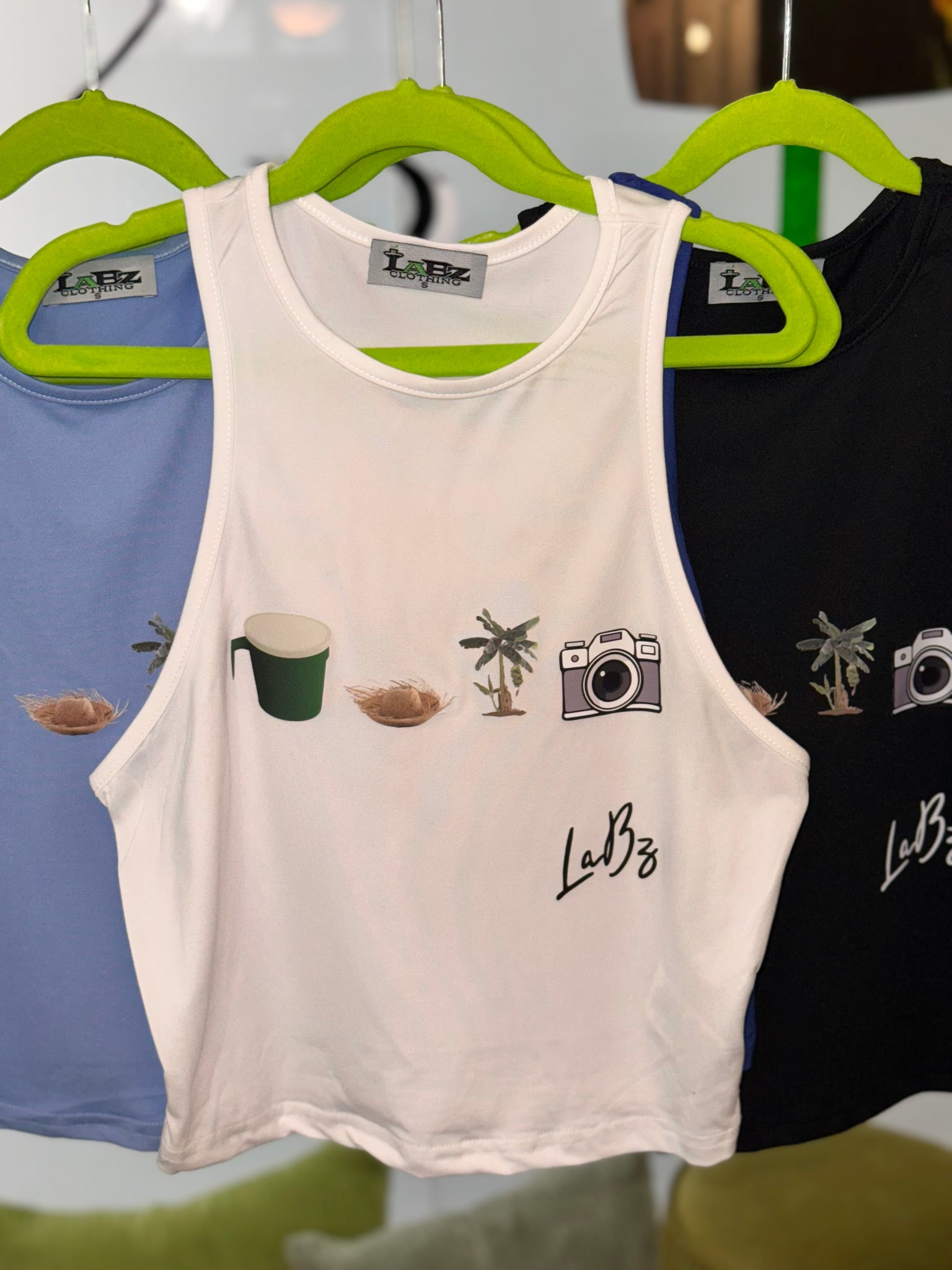 Diseño personalizado Exclusivo de LaBz inspirado en elementos de Puerto Rico, en esta ocasión este top es especial ya que lleva plasmado la famosa Tacita de mantequilla, la pava tipica de nuestro jibarito boricua, la mata de guineos verdes y por su puesto la camara.