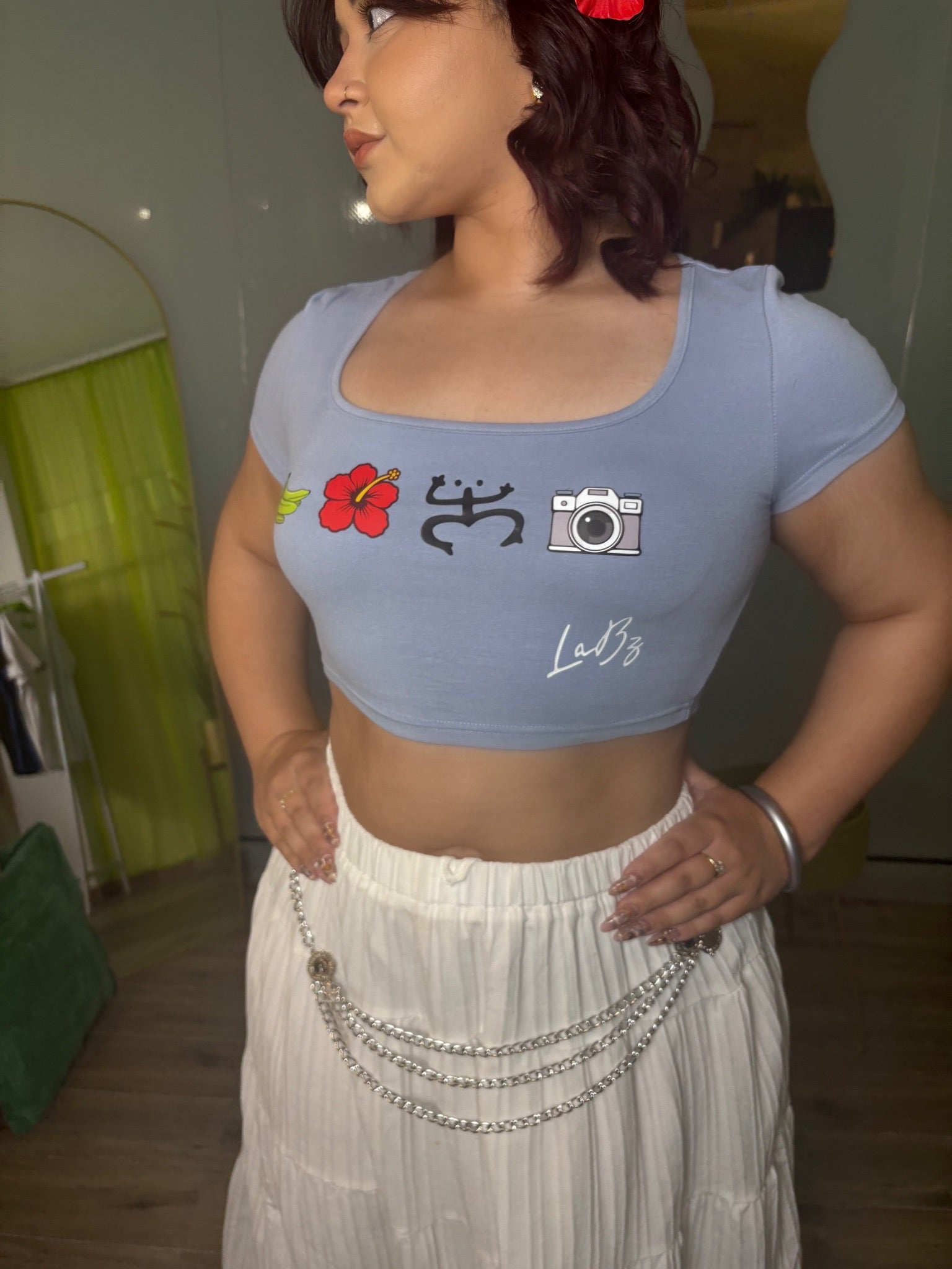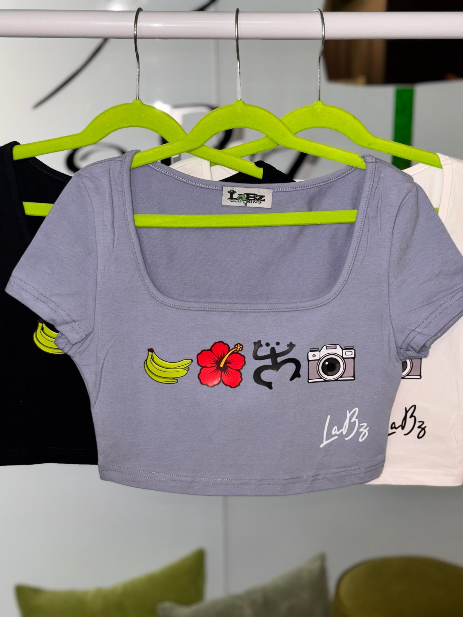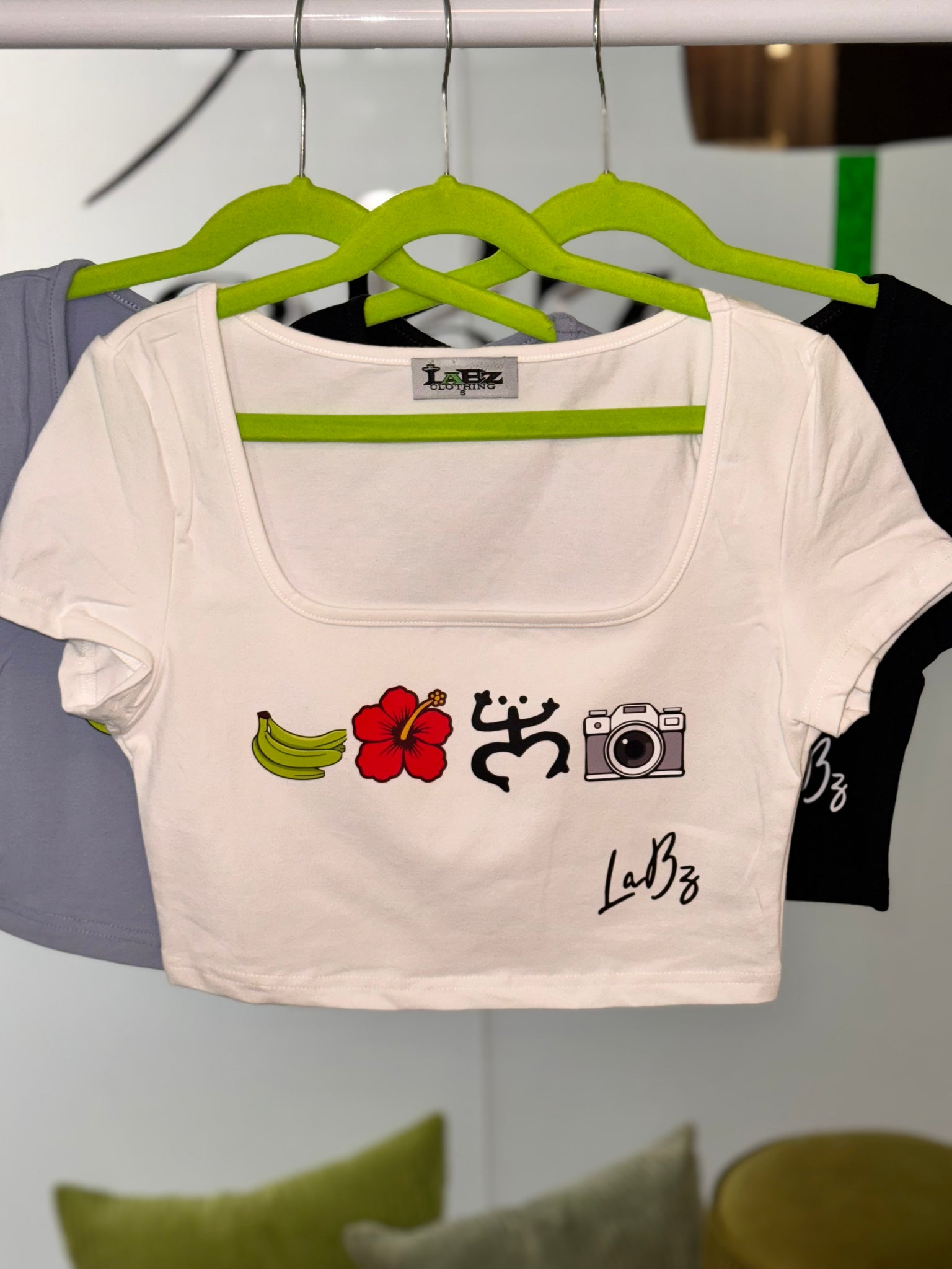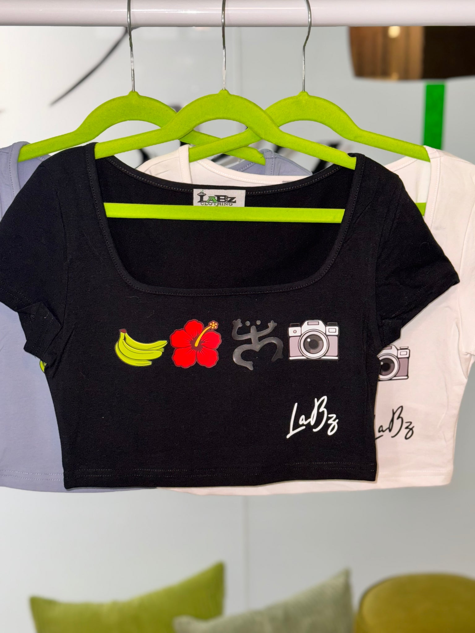 Crop top Diseño personalizado exclusivo de LaBz inspirado en elementos de Puerto Rico 🇵🇷 coleccion limitada. Diseño guineos verdes, Flor de Maga, Coqui taino y la camara. Disponibles color: Blanco, azul denim y negro.